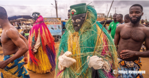 В Бенине вудуисты проходят по улицам в костюмах, символизирующих духов, которые, по поверьям, управляют природой и деятельностью людей.