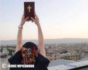 Иранская христианка воздевает Библию над своим городом. (Фото из архива ГМ)